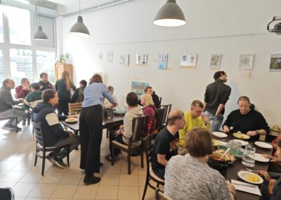 Úterní den se nesl ve znamení spolupráce a dobré nálady. Naši klienti německým hostům předvedli, jak u nás probíhá oblíbená skupinová aktivita – vaření. Společně jsme připravili tradiční buřtguláš, který měl u všech obrovský úspěch. Na závěr nechyběl sladký dezert – dorty z Café MARTIN, které si všichni pochvalovali.